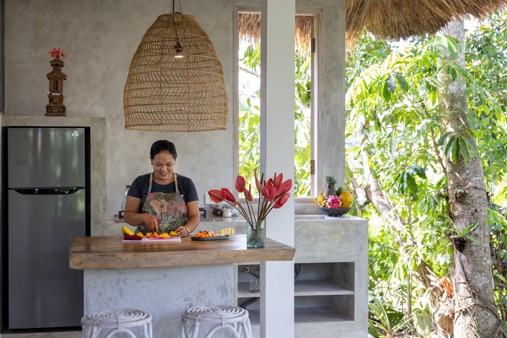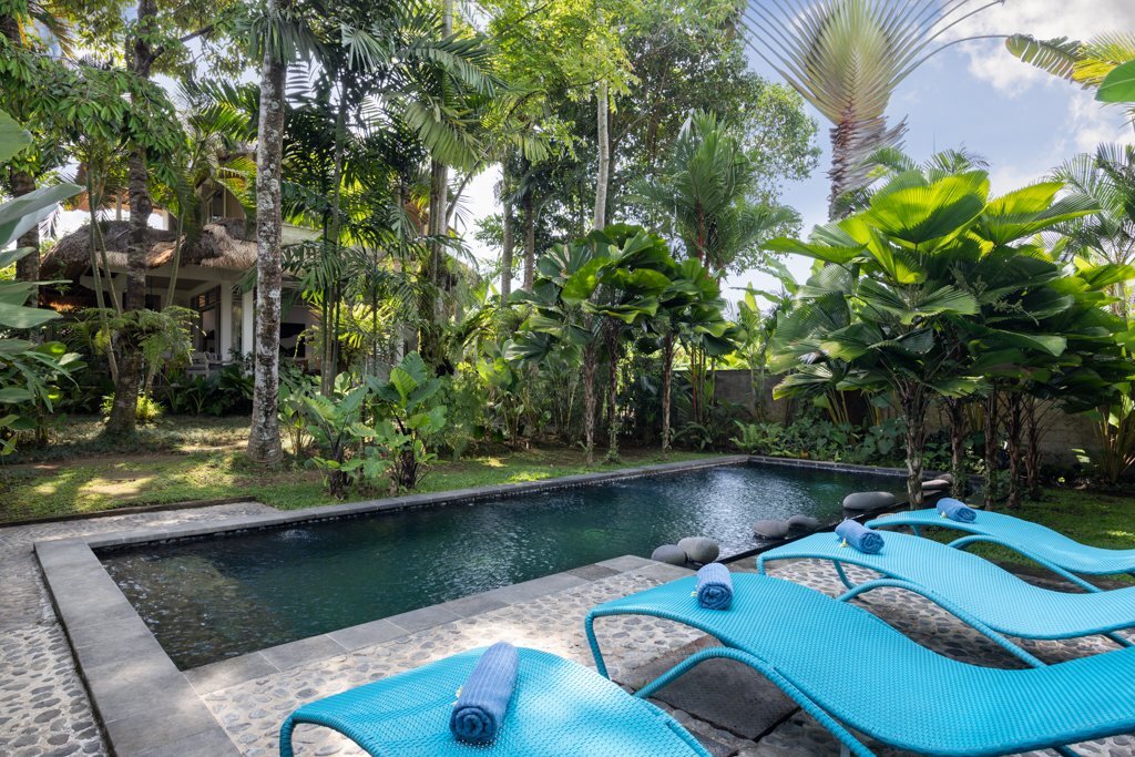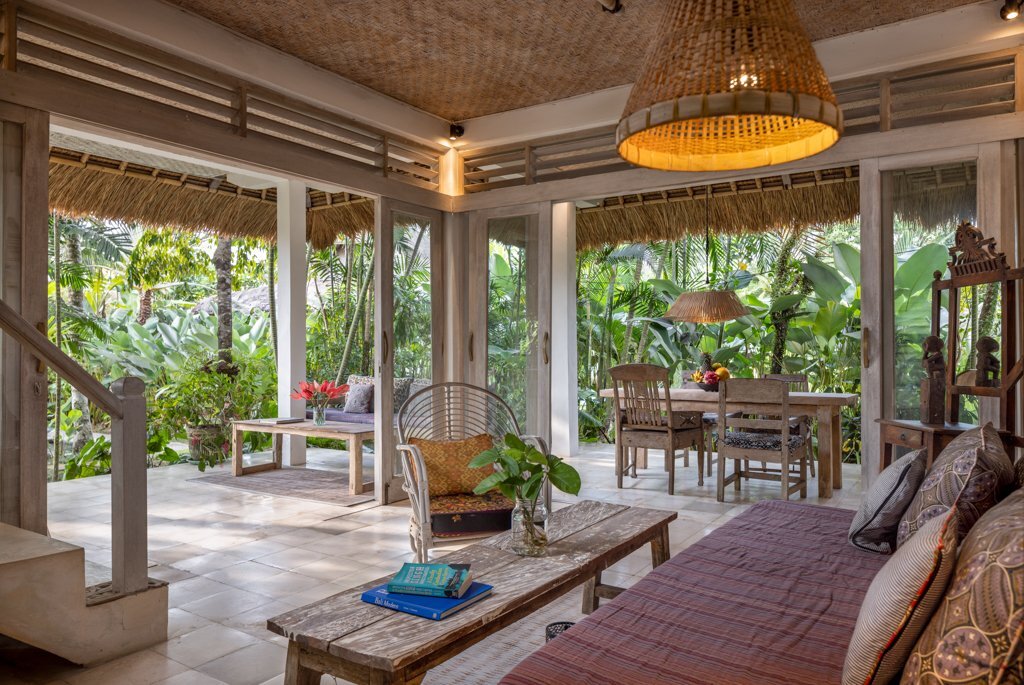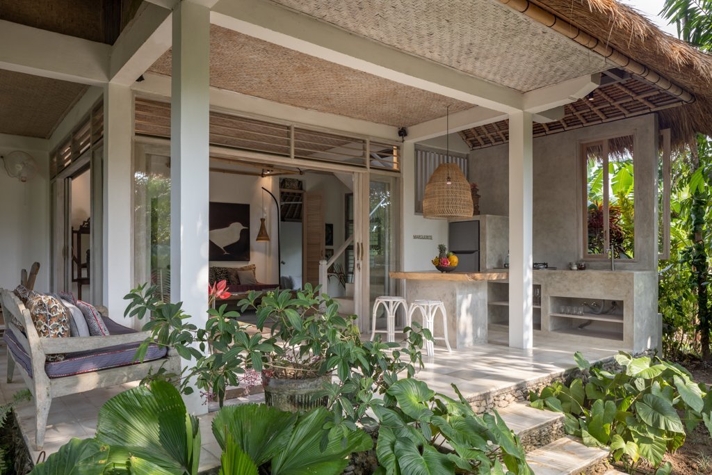 We opted for a shared pool. with one our natural villas, Jazmin to minimize lowering the water table on Bali Also the living room Marguerite, (unlike Jazmin and Passiflora), can be locked up at night, which may be more comfortable for women travelers.